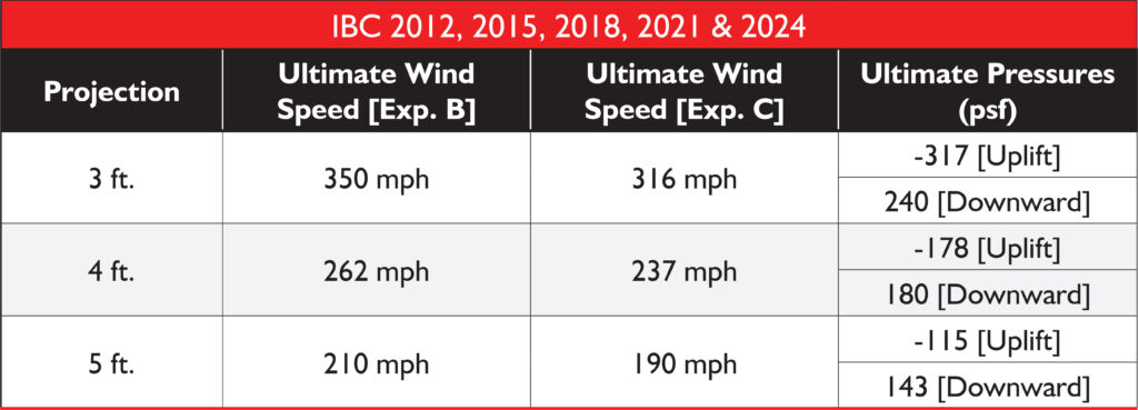 Wind loads shown are uniform loads on a 4′- 6″ wide canopy with 2 braces.