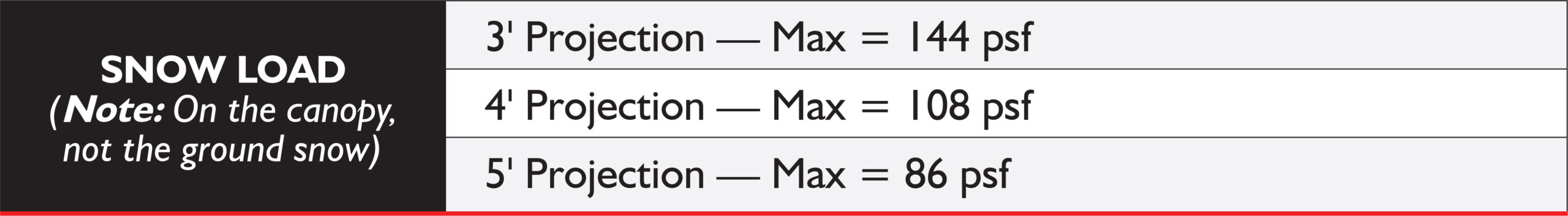Snow loads shown are uniform loads on a 4′-6″ wide canopy with 2 braces. Snow loads shall be determined by engineer utilizing applicable codes and project-specific design criteria.